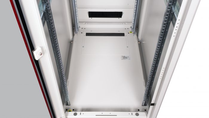 A highlight of the design is the emphasis on cable management. The cabinet base incorporates a sliding cable entry panel sealed with rubber. Cabinets of 26U and above are outfitted with two cable entries featuring brush strips at the rear, both above and below the door. The 800 mm width cabinets offer advanced cable management options, including additional cable entries with brushes on the top and base. Additionally, these wider cabinets include vertical cable ducts with shutters on both sides, adjacent to the 483 mm (19") profile rails in the front.