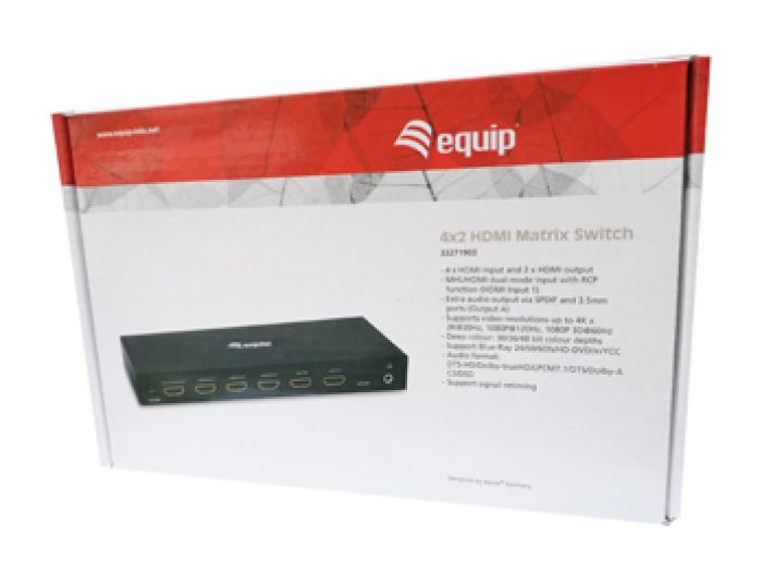 Save time and hassle by automatically switching between your HDMI audio/video sources, using Equip 2x4 HDMI Matrix Switcher. This easy-to-use HDMI Matrix switch ensures seamless transition while switching video and display sources, with EDID copy maintaining your video resolution.