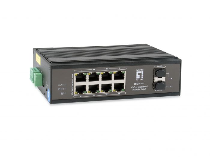 LevelOne IGP-1031 Industry Ethernet Switch provides 8 PoE ports 10/100/1000Base plus 2 port Gigabit SFP to enable high speed network at mission-critical environment. With the industrial standard DIN-rail mount; this switch can be easily installed in the cabinet, plus the clearly visible status LEDs provide simple monitoring of port link activity. Moreover, the SFP slots support pluggable modules that enabling you to choose from a variety of transceivers. This switch is Power Sourcing Equipment (PSE), and it is fully complied with IEEE802.3af/at PoE standard at maximum 30W each port power budget. It helps to save infrastructure wiring costs dramatically by eliminating electric wiring and less UPS needed. Also, it is compatible with IEEE802.3af standard PD devices.